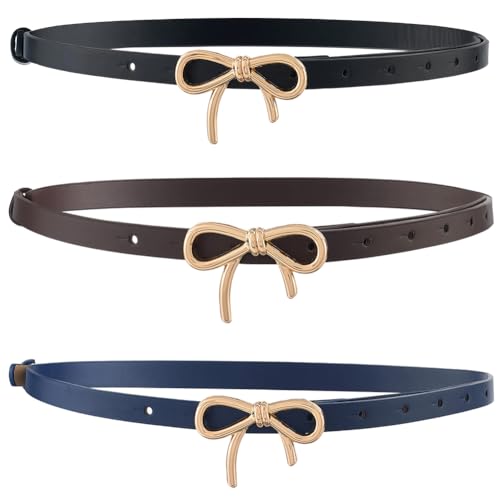 3 Colors 0.5 Inch Width Thin Waist Belts PU Leather Bow Skinny Belts with Gold Alloy Bowknot Buckle Elegantes Adjustable Slim Leather Waist Strap for Women Ladies Dresses Jeans Pants 5