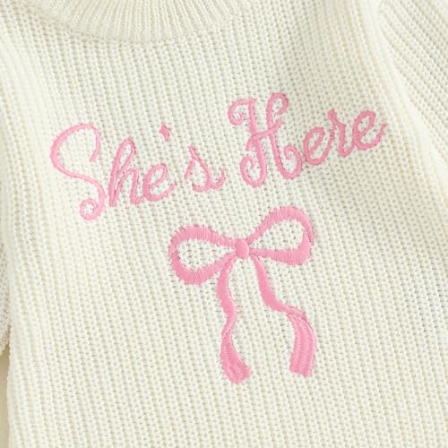 • Features: Baby girl knit sweater onesie, baby girl long sleeve crew neck romper; 'She's Here' Embroidery bow pattern romper for baby girl, makes baby girls more fashionable; Crotch buttons are designed for convenient diaper changing