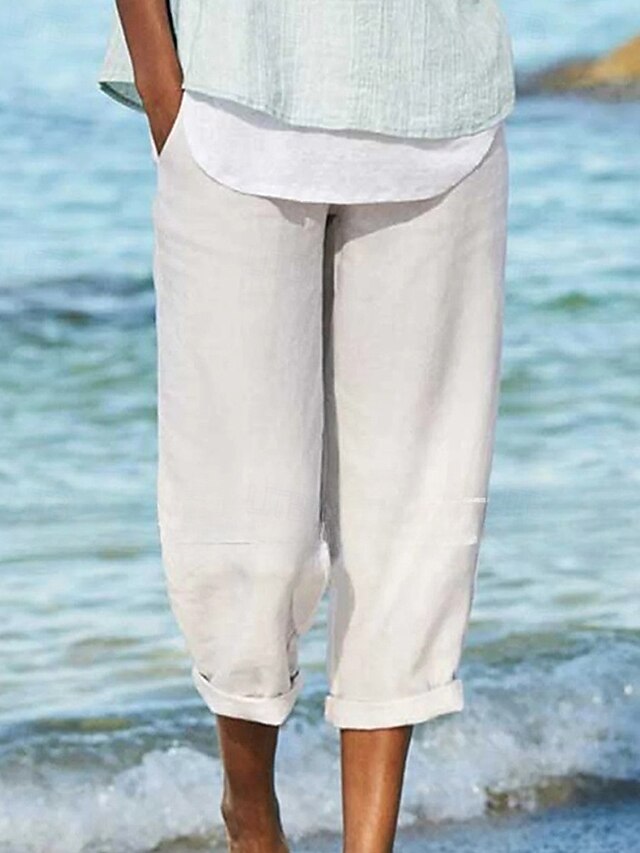 More information about Women's Cotton Linen Pants Slacks Streetwear Casual Ankle-Length Natural Plain Pocket Elastic Waist Comfy Outdoor Street Going out White Yellow Pink Blue Summer Regular Fit