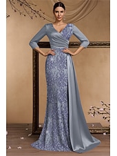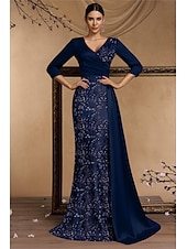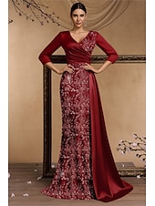 More information about Burgundy Floral Sequin Embroidered Lace Mermaid / Trumpet Evening Gown Elegant Dress Formal Wedding Sweep / Brush Train 3/4 Length Sleeve V Neck Satin with Pleats