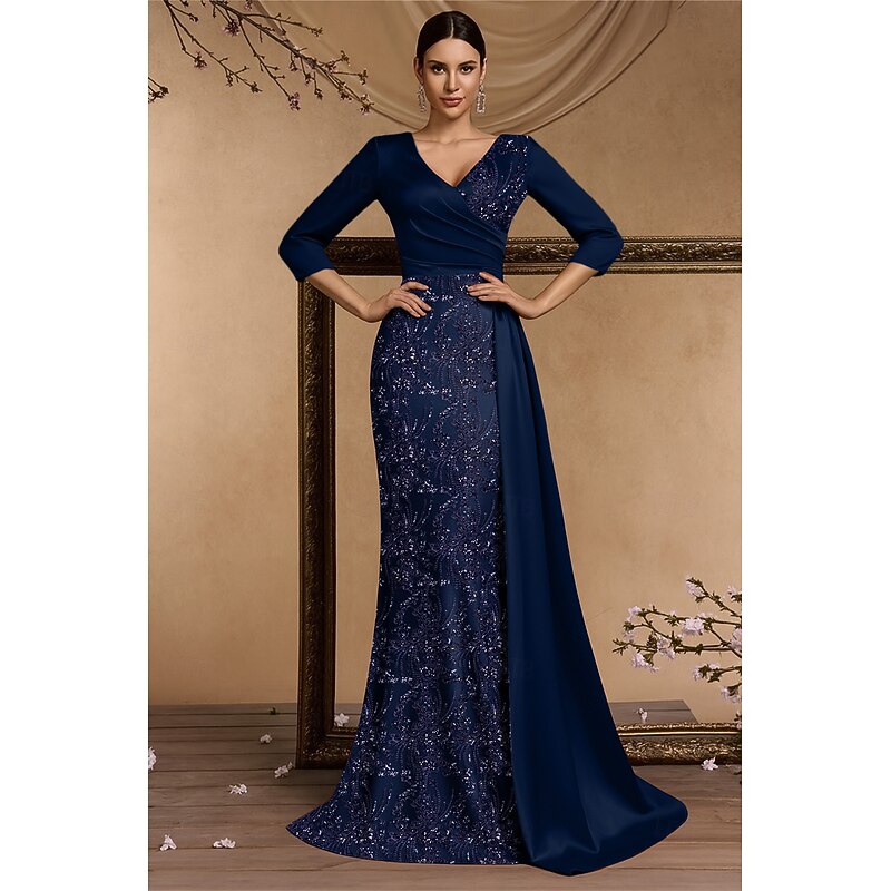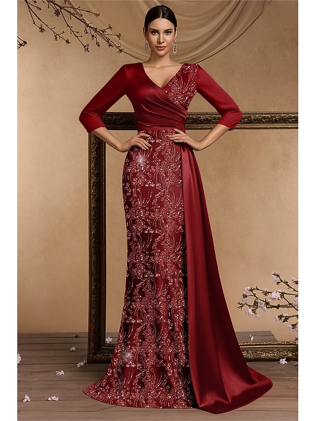 HOT ! Burgundy Floral Sequin Embroidered Lace Mermaid / Trumpet Evening Gown Elegant Dress Formal Wedding Sweep / Brush Train 3/4 Length Sleeve V Neck Satin with Pleats