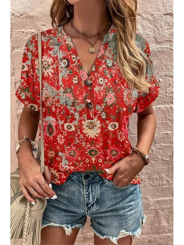 More information about Women's T Shirt Graphic Tribal Stylish Casual Boho Short Sleeve V Neck Regular Tops Daily Going out Weekend Print Black and White Red Purple Red / Blue Summer Spring