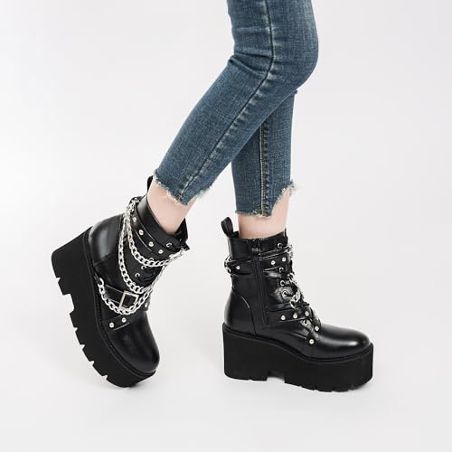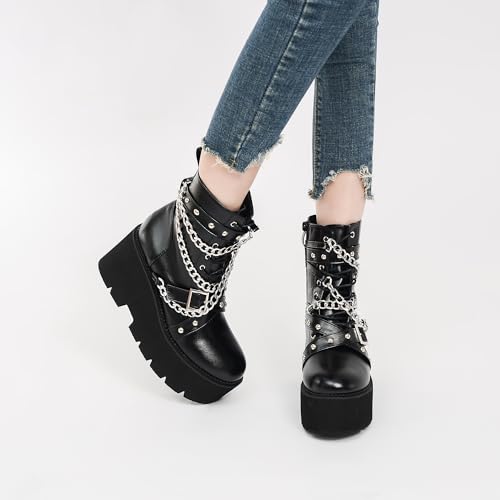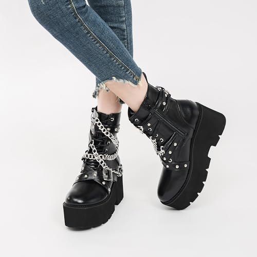Women's Fashion Goth Boots,Black Chunky Platform Combat Ankle Booties Zipper Punk Boots Mid Calf Boots for Women 7