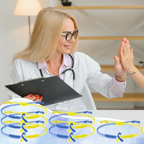 • Blue Yellow Braided Bracelets: these bracelets are made of soft wax rope and alloy, blue yellow ribbon braided bracelets to show your support for down syndrome awareness and call on others to raise awareness