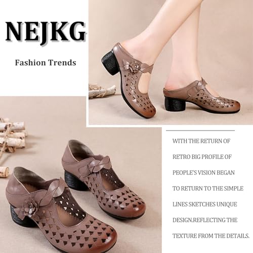 Women's Leather Hollow Chunky Heel Mary Janes Casual Round Toe Hook and Loop Soft Non-Slip Dress Pumps Comfort Flower Evening Dating Sandals 5