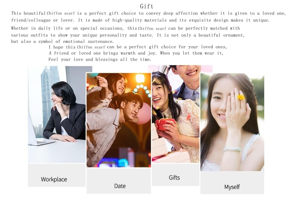 • ❤Light Soft Scarves Material: Made of chiffon, feels soft and smooth, lightweight and comfortable, giving you different wearing experience.Chiffon Scarf Women, Light Weight and Soft Skin-friendly. This elegance sheer scarf fabric is super soft, very light, breathable and excellent quality and ideal for daily casual wearing for the all seasons.