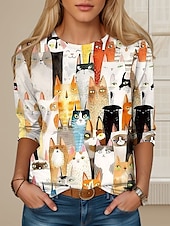More information about Women's T shirt Long Sleeve Crew Neck Long Sleeve Tunic Cat Print Regular Tops Round Neck Daily Weekend Black Yellow Orange Spring & Fall Prefall