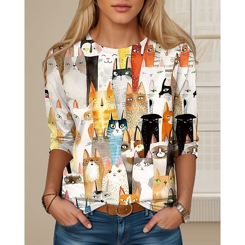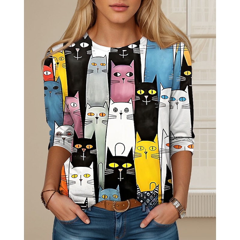 Highlights [Fabric] : Crafted from durable polyester, this long sleeve T-shirt features a micro-elastic composition that ensures comfort and longevity, making it suitable for regular wear. [Fit] : The top offers a regular fit with a classic round neckline, designed to provide both ease and style. Its long sleeves are perfect for transitional seasons, offering a cozy and comfortable feel. [Design Highlights] : Adorned with a playful 3D cat print, this T-shirt showcases various colorful cat designs. The whimsical print adds a unique and fun flair, making it an ideal choice for cat enthusiasts and those with a love for quirky fashion. [Occasions] : Perfect for daily wear or weekend outings, this T-shirt seamlessly blends into your Spring and Fall wardrobe. Pair it with jeans for a casual yet fashionable look suitable for any relaxed setting. [Size Range] : Available in sizes S to 2XL, accommodating a wide range of body types to ensure the perfect fit for everyone.