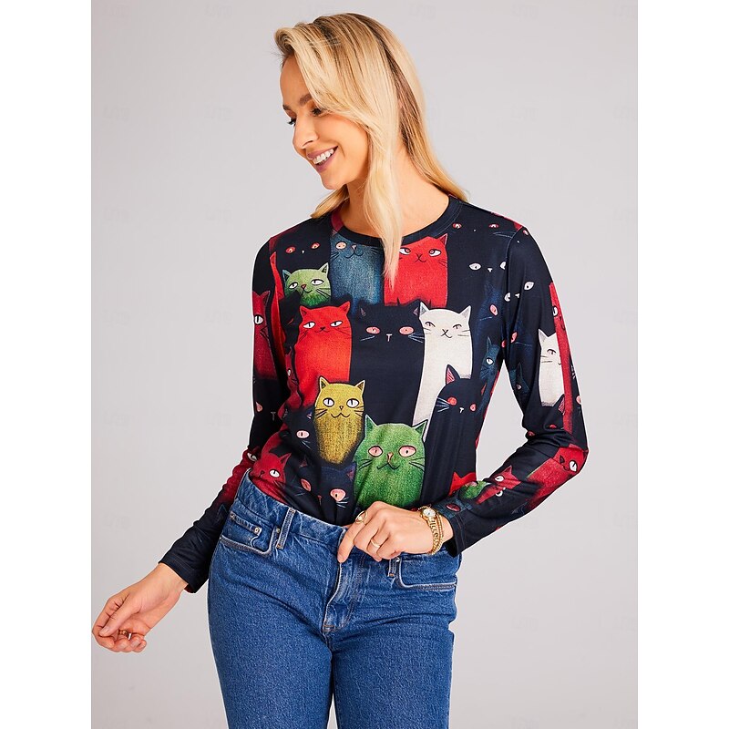 Women's T shirt Long Sleeve Crew Neck Long Sleeve Tunic Cat Print Regular Tops Round Neck Daily Weekend Black Yellow Orange Spring & Fall Prefall 9
