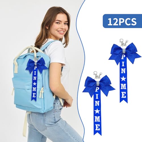 HOT ! 12 Pcs Cheer Pin Me Ribbon for Backpack Bow Keychain with Glitter Rhinestones Bow Cheer Competition for Girls Cheerleading Sports Accessory Gifts (Blue)