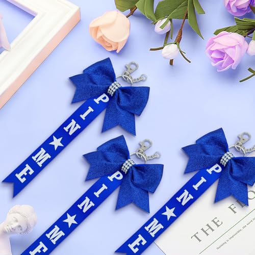 12 Pcs Cheer Pin Me Ribbon for Backpack Bow Keychain with Glitter Rhinestones Bow Cheer Competition for Girls Cheerleading Sports Accessory Gifts (Blue) 4
