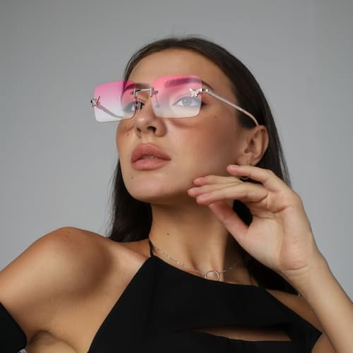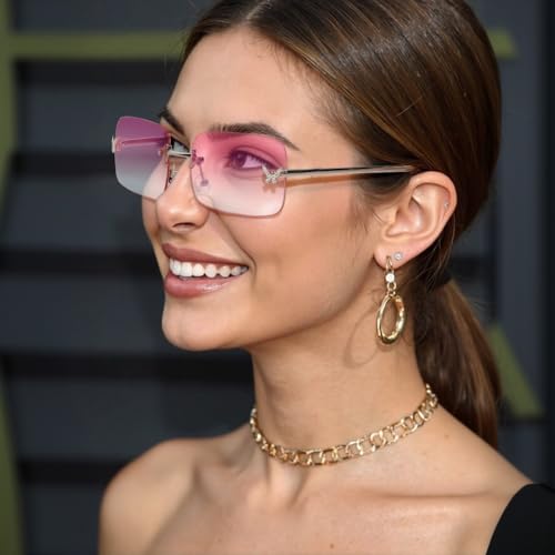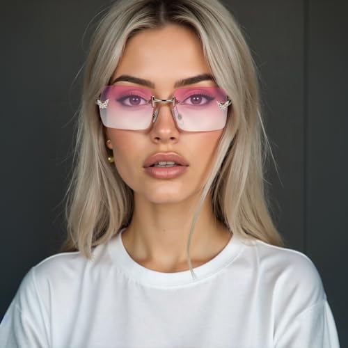• Rectangle Y2k Sunglasses: fashion vintage retro shades glasses, gradient color, the shiny little butterflies on the lens are full of Y2K style. The rimless design and delicate metallic detail add a chic look