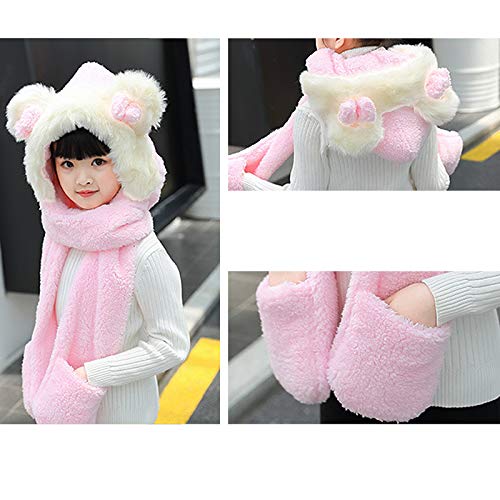 Girls Cute Bowknot Hooded Scarf Versatile 3-in-1 Winter Warm Hat with Scarf Pocket Gloves 3