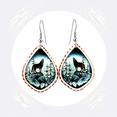 • Handcrafted wolf earrings in a teardrop shape, featuring a Northern Lights backdrop. These animal-themed earrings are unique wolf jewelry. Wolf gifts for her.