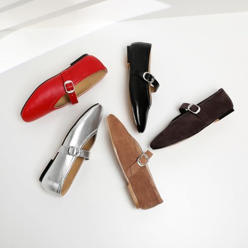 RIBONGZ Women's Flats Foldable Ballet Mary Jane Round Toe Dress Shoes with Ankle Strap Buckle Comfortable Slip On Leather Flat Girls Ballerina Shoes for Office Work Party Walking Casual 6