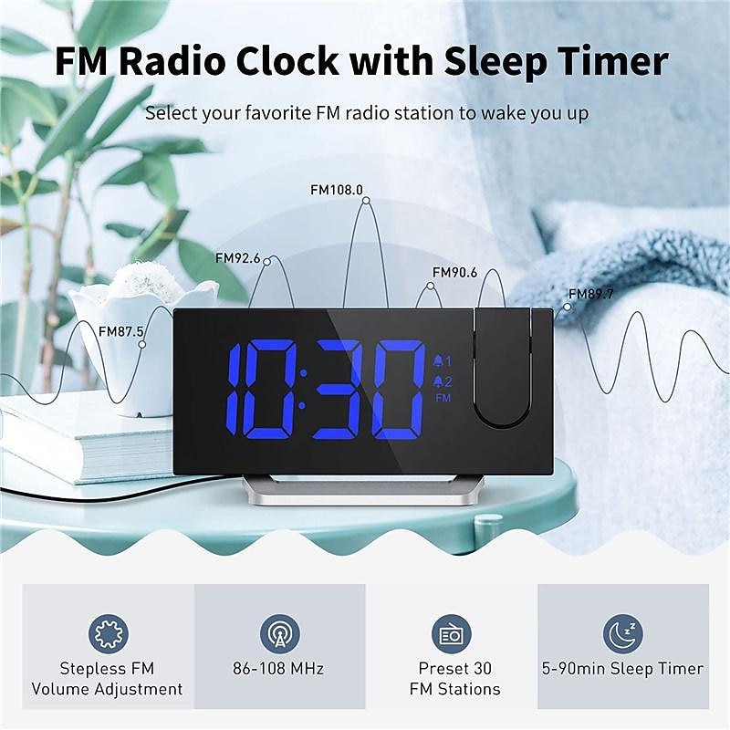 Projection Clocks FM Radio Curved-Screen Digital Alarm Clock LED Display with Dimmer Dual Alarm with USB Charging Port 12/24 Hours Backup Battery for Clock Setting 11
