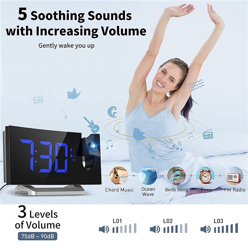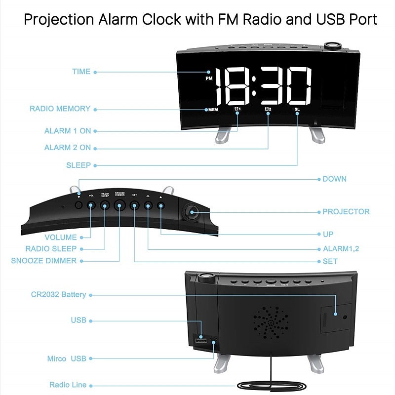 Highlights Product Selling Points: - Multifunctional Projection FM Radio Alarm Clock: This clock has a 120° rotatable projector that can project the time onto your ceiling or wall. It has a range of 1.6-10ft and the projection can swivel 180°. - 7 Dimmable LED Screen Display: The clock has 4 adjustable screen display brightness options (OFF-Low-Medium-Bright). It also has an Auto Mode that adjusts the brightness according to the environment, protecting your eyes at night and saving energy. - Dual Alarm with Snooze: You can set two separate wake-up times and choose to wake up to your favorite radio station or a standard buzzer. The snooze function gives you an extra 5-60 minutes of sleep before alerting you again. - FM Radio Clock with Sleep Timer: The clock can remember up to 15 FM preset stations and has a 33-inch antenna for better reception. The sleep timer function allows you to fall asleep to the radio and it will automatically turn off after the specified time. - Backup Battery and USB Charging Port: The clock has a built-in backup battery that saves the settings in case of power outages. It also has a USB output interface for easy charging of iPhone or Android smartphones. - Additional Features: The clock supports both 12 and 24-hour time format, has a light sensor to adjust brightness automatically, and offers dimmer options for both the projection and screen display. It comes with 7 keys for easy navigation and operation. - Note: Please read the user manual carefully before using the clock, remove the plastic insulator tab before starting up, and use the original cable of your mobile phone for charging. The backup battery is for maintaining the clock time and not for powering the clock.