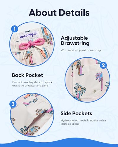 • SAFETY DESIGN: The boys' swimming trunks feature an elastic waistband and adjustable drawstring design to better fit children's body shape. The waistband combined with safety-tipped drawstring to ensure stability and not fall off. Meanwhile, the shorts are above the knee length to prevent your child from tripping while running