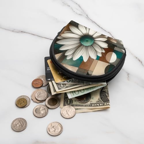 Portable Coin Purse Geometric-White-Daisy Mini Zippered Money Pouch Card Holder 1
