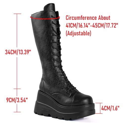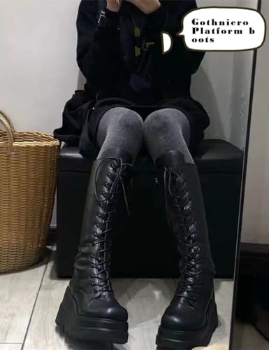 Gothniero Women Black Platform Goth Boots Mid Calf with Heel Knee High Boots Winter Chunky Heel Punk Rave Boots Girls Lace Up Combat Booties Size 5.5-11