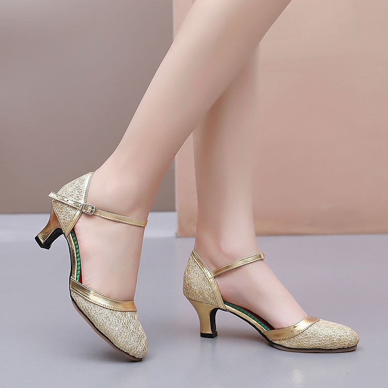 Highlights [Fabric & Construction] : Crafted from high-quality leather and synthetic materials, these women's ballroom shoes showcase a luxurious and shimmery finish, enhanced by exquisite glitter embellishments. The cracked pattern on the fabric adds a rich texture and a hint of sophistication to each pair. [Silhouette & Fit] : Designed with a 1-2 inch Cuban heel, these shoes provide the perfect balance of height and comfort, making them ideal for hours of wear. The closed toe design offers added elegance and support, ensuring your feet feel secure and stylish at all times. [Design Highlights] : A standout feature of these shoes is the metallic ankle strap available in striking gold or silver, which not only offers a secure fit but also enhances the chic aesthetic of the shoes. The vibrant red cushioned insole assures comfort, even during extended periods of use. [Occasions] : Perfectly suited for a variety of occasions such as evening parties, outdoor events, ballroom dance, and waltz routines. These shoes seamlessly blend style and function, making them an ideal choice for formal gatherings and elegant dance performances. [Size Range] : Available in a wide range of sizes from 34 to 42, ensuring a perfect fit for different foot shapes. These shoes are designed to cater to varied preferences and needs, making them a versatile addition to any wardrobe.
