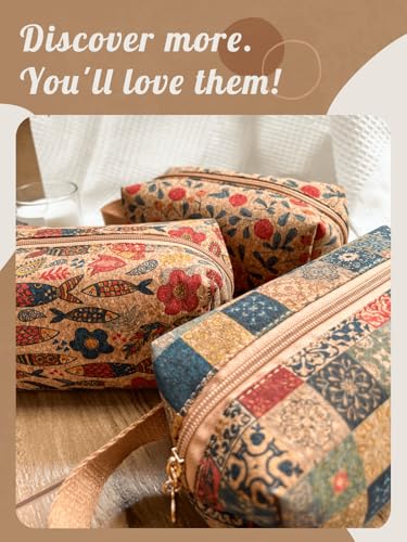 HOT ! Boho Cork Makeup Bag, Vintage Floral Art Pouch, Patchwork Pattern, 7.5 x 3.5 x 3.5 Inches, Bohemian Cosmetic Pouch, Hippie Travel Organizer, Boho Pencil Pouch