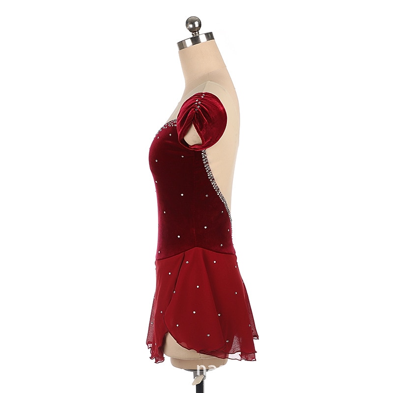 More information about Figure Skating Dress Women's Girls' Ice Skating Dress Outfits Burgundy Royal Blue Patchwork Asymmetric Hem Mesh Spandex High Elasticity Training Competition Skating Wear Handmade Crystal / Rhinestone