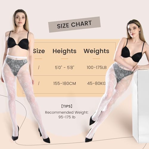 • Universal Size: Our black white lace tights for women are designed to fit a wide range of body types, suitable for heights from 5'08" to 5'74" and weights between 99-175 lbs, ensuring a comfortable fit for everyone