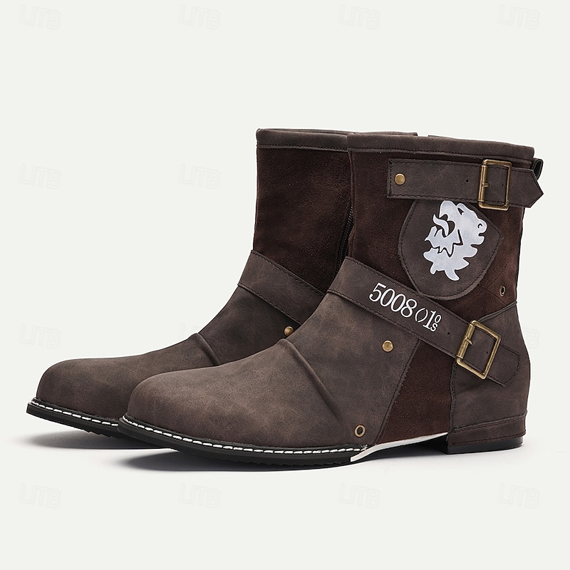 HOT ! Men's Steampunk Motorcycle Boots with Double Buckle Straps and Embossed Lion Design - Brown Faux Leather Ankle Boots