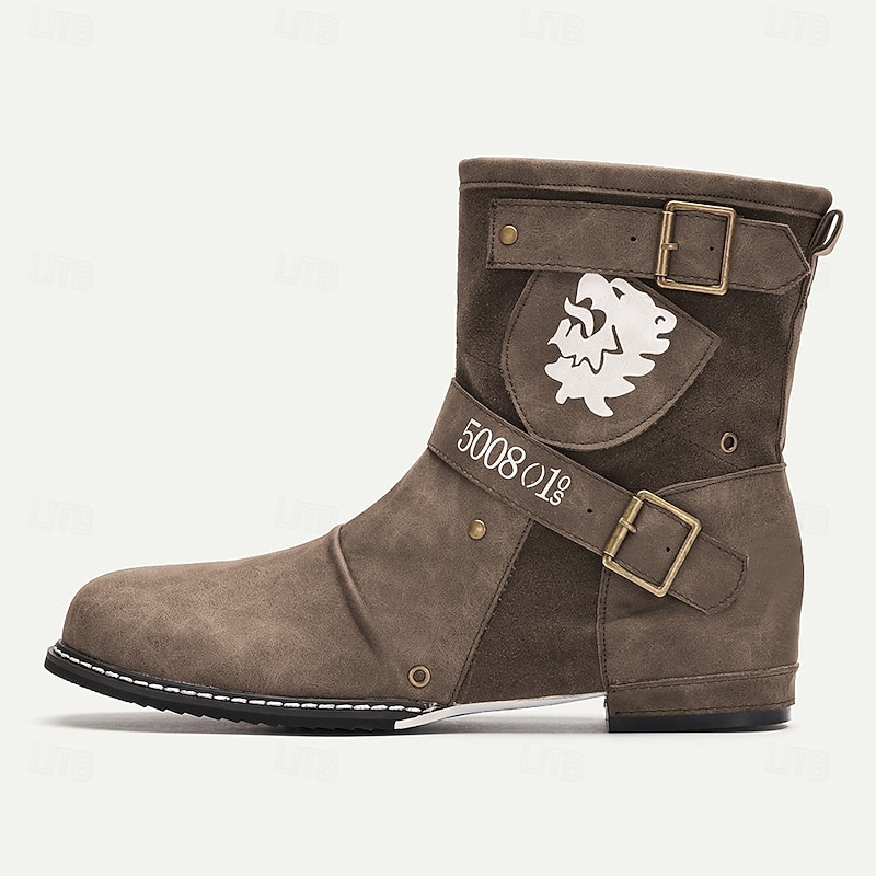 Men's Steampunk Motorcycle Boots with Double Buckle Straps and Embossed Lion Design - Brown Faux Leather Ankle Boots 1