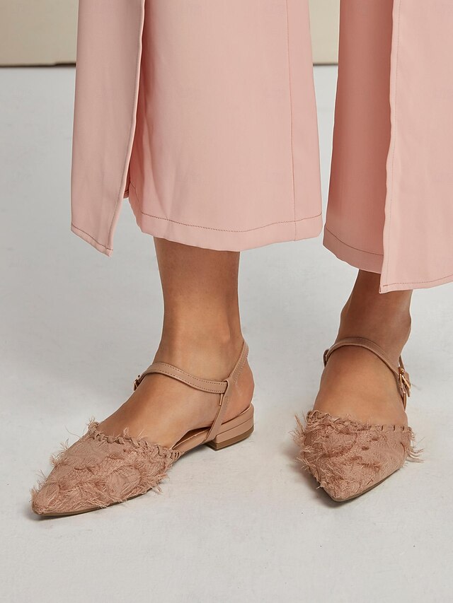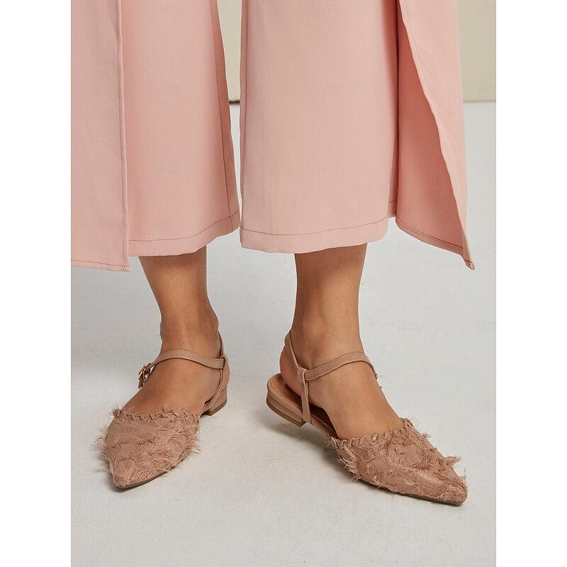 Highlights [Fabric] : These elegant slingback flats are crafted from a combination of satin and faux leather, providing a luxurious texture and feel. The soft, neutral beige color allows for versatile pairing with various outfits, while the fringe embellishment introduces a playful bohemian element. [Silhouette] : Designed with a classic flat heel, these shoes offer both style and practicality, ensuring comfort throughout the day. The pointed toe adds a sleek touch, enhancing the overall chic appearance of the flats. [Design Highlights] : The standout feature of these flats is the fringed fabric detail atop the shoe, adding a unique texture and visual interest. An adjustable ankle strap ensures a secure, customizable fit, and the inclusion of tassel embellishments introduces a trendy and fashionable accent. [Occasions] : Ideal for a variety of settings, these flats can effortlessly transition from business casual environments to leisurely daily outings. Their elegant yet understated design makes them suitable for both work and vacation scenarios, offering a blend of sophistication and comfort. [Size Range] : Available in a range of sizes, including US5.5 (EU35, UK3.5) to US9 (EU40, UK7), ensuring a fit for different foot sizes and preferences.