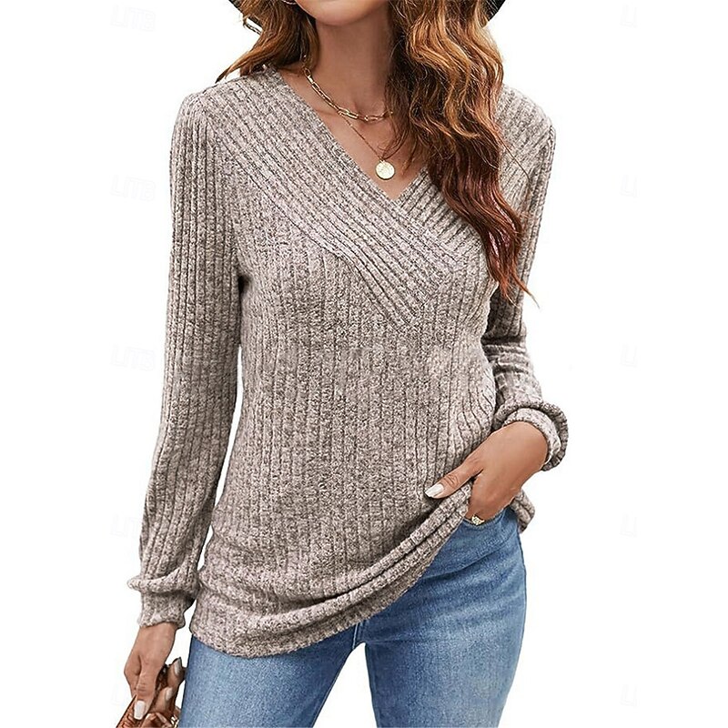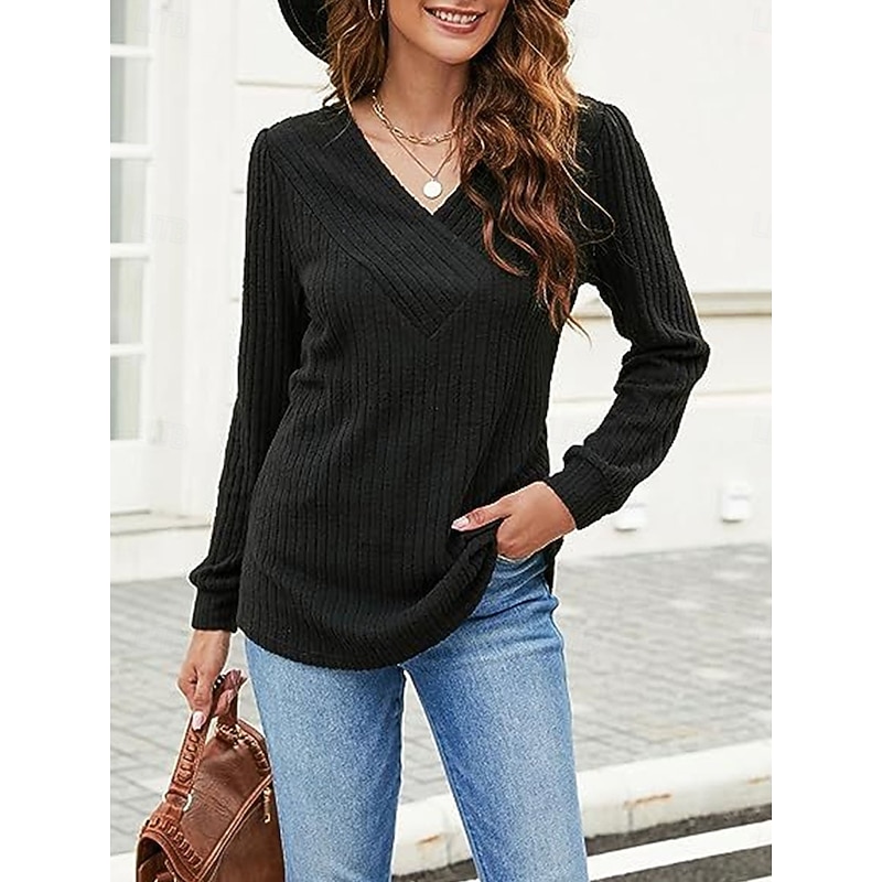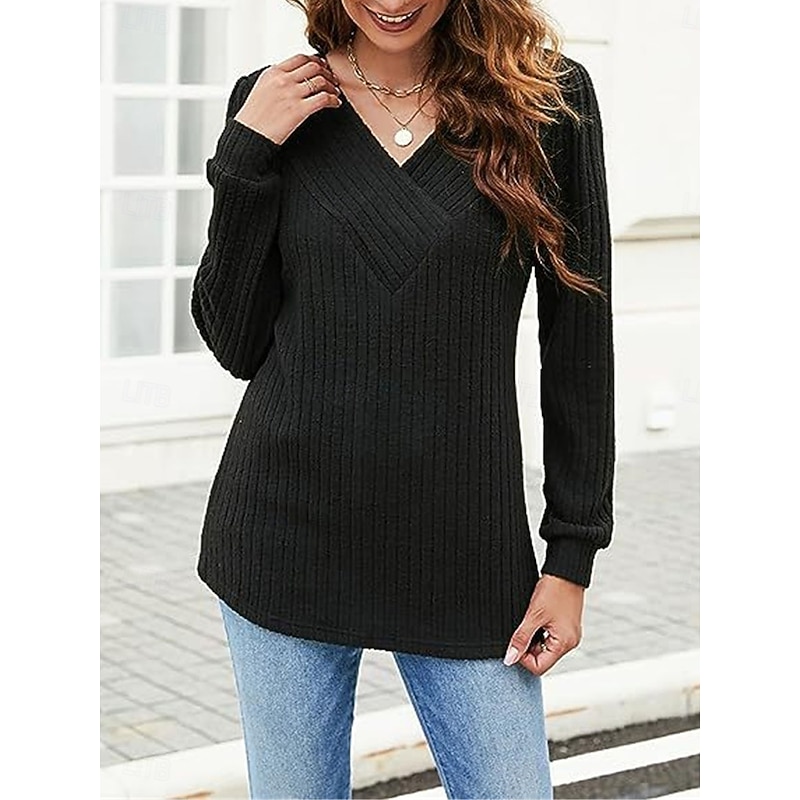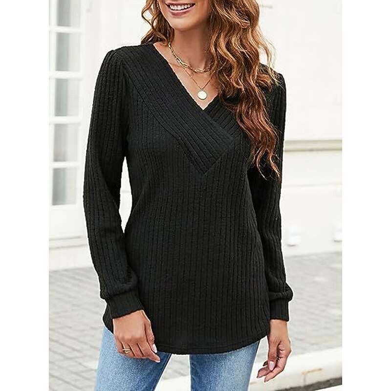 Highlights [Fabric] : Crafted from a soft, ribbed knit polyester, this women's sweater offers micro-elasticity for added comfort, making it perfect for cooler fall and winter days. [Fit] : The sweater features a regular fit that provides a relaxed silhouette, allowing for ease of movement while maintaining a stylish appearance. [Design Highlights] : With a flattering V-neckline, this sweater embraces a minimalist design with pure color options. Long sleeves and a regular top length create a classic look, while the knitted ribbed texture adds a touch of elegance. [Occasions] : Versatile in style, this pullover sweater is ideal for daily wear, outdoor activities, and weekend getaways. Whether you're dressing up for a casual meeting or dressing down for a laid-back day out, it pairs effortlessly with jeans or leggings. [Size Range] : Available in sizes S, M, L, and XL, this sweater suits a variety of body types, ensuring a comfortable and chic fit for all.