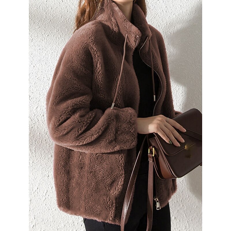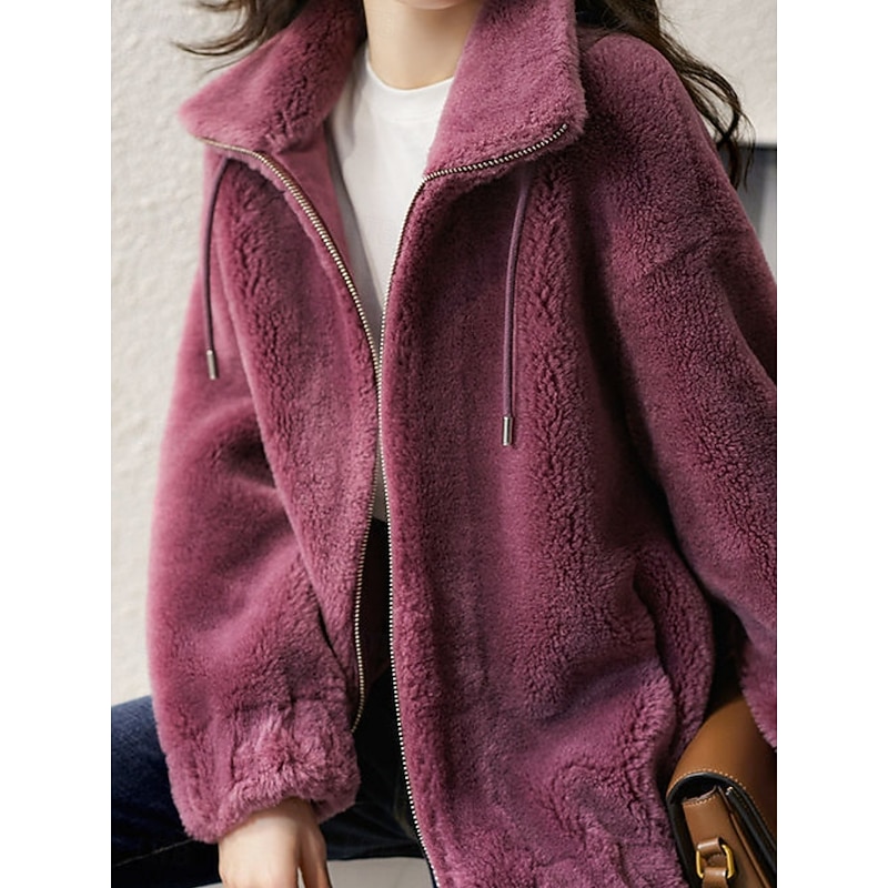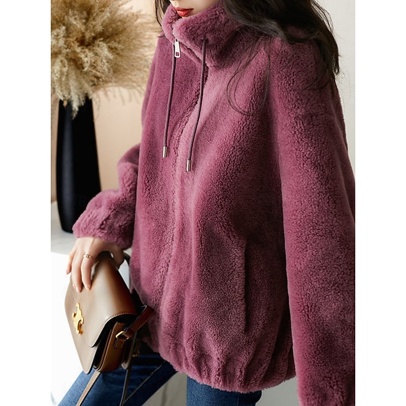 More information about Women's Sherpa Jacket Casual Jacket Comfortable Breathable Zipper Casual Plain Vacation Street Casual Daily Wear Zipper Regular Stand Collar Regular Fit Long Sleeve Outerwear Black Purple Fuchsia