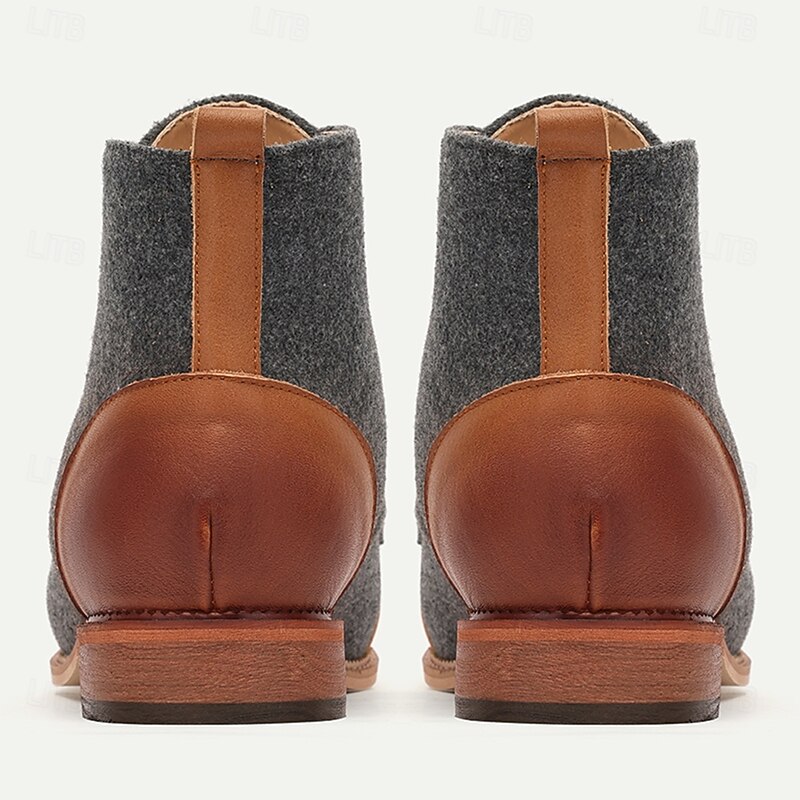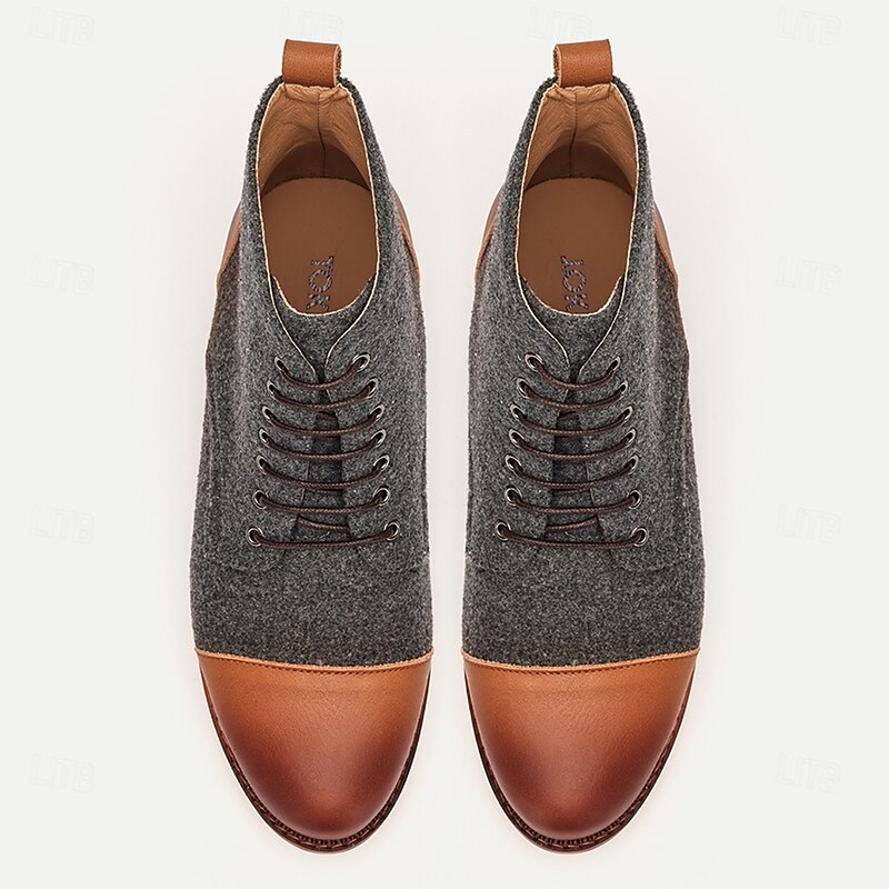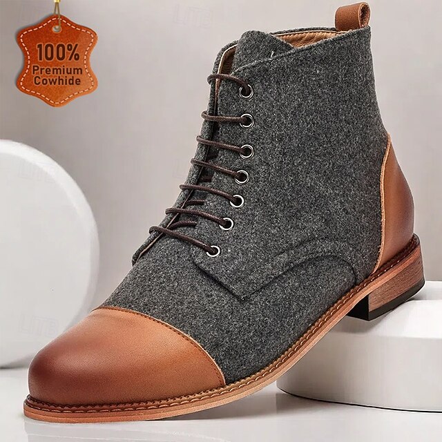 Highlights [Fabric] Crafted with a blend of premium leather and finely textured fabric, these men's vintage lace-up ankle boots offer both durability and a modern aesthetic. The leather upper ensures a rich, sophisticated finish, complemented by the soft cloth fabric for added warmth and comfort. [Fit] Designed for a comfortable fit, these boots feature a round toe shape that allows for ease of movement, making them suitable for all-day wear. The lace-up closure with metal eyelets ensures a secure and adjustable fit for any foot shape. [Design Highlights] These ankle boots boast a classic design with a vintage flair, highlighted by metal eyelets and a robust sole. The contrasting textures of leather and fabric add a touch of elegance, while the leather toe cap and heel provide enhanced durability and style. [Occasions] Perfect for both casual and semi-formal occasions, these versatile boots are ideal for daily wear, weekend outings, and semi-formal gatherings. They seamlessly blend traditional craftsmanship with contemporary style, making them a perfect choice for the modern gentleman. [Size Range] Available in a wide range of sizes from US 8 to US 16, ensuring a suitable fit for various foot sizes. These boots are designed to accommodate different preferences and provide a comfortable wearing experience for all.