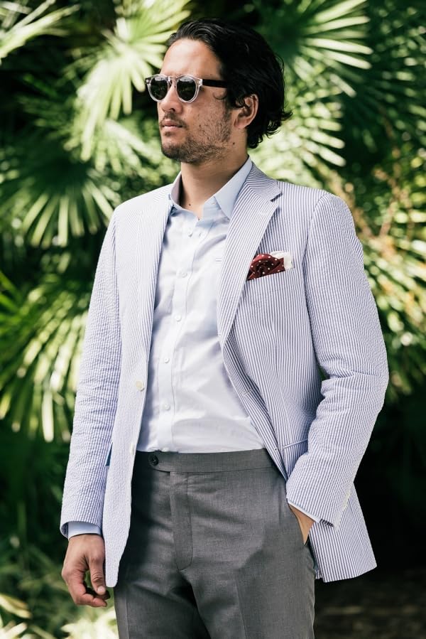 • [MATERIAL]: Seersucker, a classic American fabric, seersucker is great warm-weather occasions. Whimsical, fun, and uniquely textured, the coolness and distinctive appearance of seersucker have made it a popular warm- and hot-weather option for stylish gentlemen across the globe, and it is regularly used to make jackets.