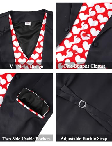 • Mens Valentine's vest with bowtie, V-neck design, love heart graphic bow tie, Five-button closure at front, two side pockets, adjustable buckle strap on back.