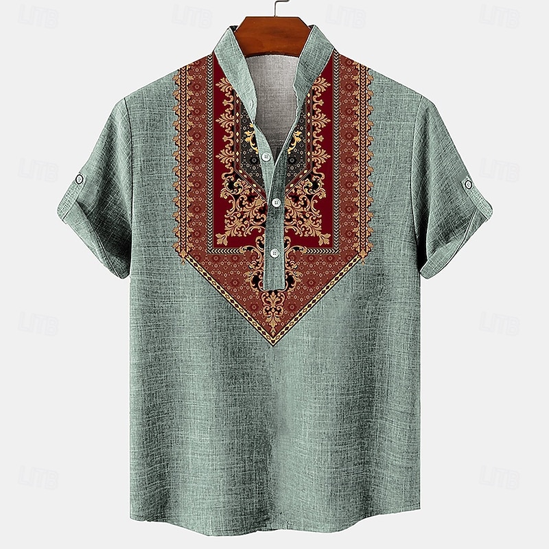 More information about Men's Linen Shirt Henley Shirt Retro Shirts Vintage Shirt Ethnic Shirt Ethnic Vacation Dailywear Green Khaki Gray Short Sleeve Mandarin Collar Summer Spring Clothing Apparel Buttons