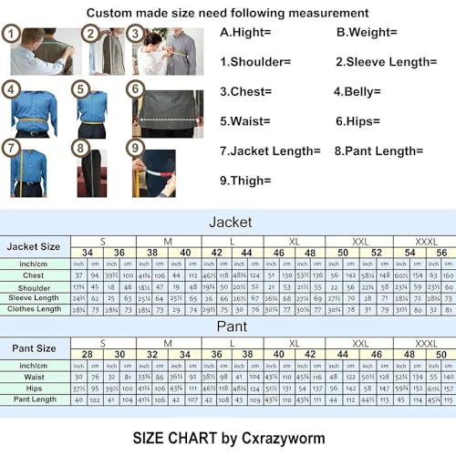 • The men’s suits is handmade and due to the lighting, it is normal for there to be a size different of 1 to 3 centimeters and slight color differences.