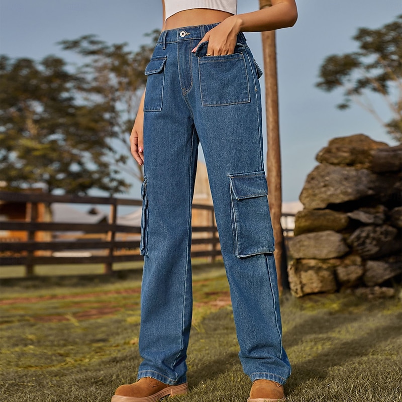 : These jeans come with practical cargo pockets on the sides, giving them a functional and stylish utility look. The medium waistline, combined with a secure button and zipper closure, ensures a snug fit. The design is finished with a clean, non-printing pattern, emphasizing simplicity and elegance.
