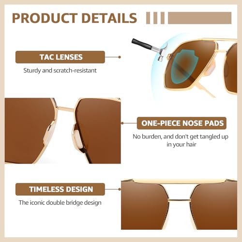 TJUTR Oversized Tangle‑Free Aviator Sunglasses for Women & Men, Polarized UV400 Shades, Square Metal Frame with Double‑Bridge 6