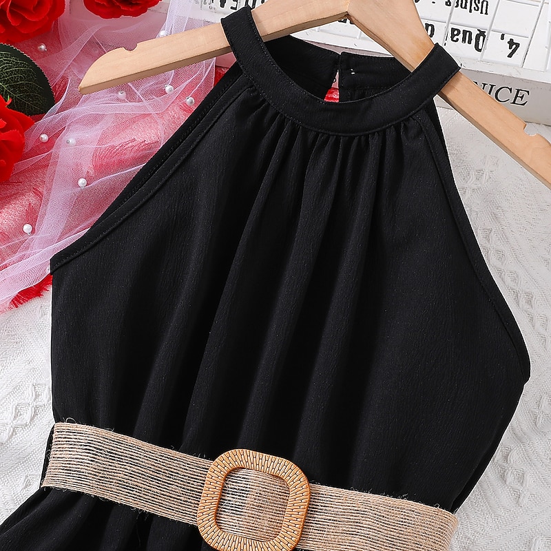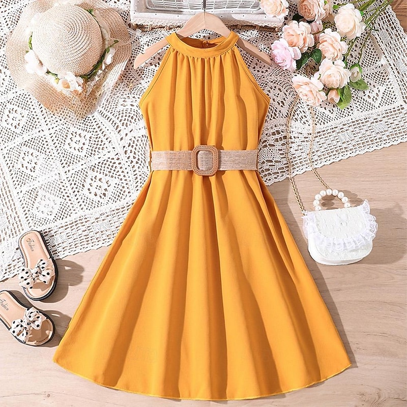 HOT ! Kids Girls' Dress Solid Color Halter Neck Dress Above Knee Dress School Halter Off Shoulder Sleeveless Fashion Dress 7-13 Years Summer Light Green