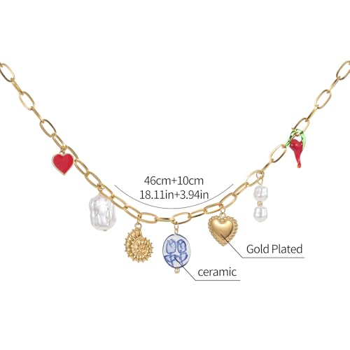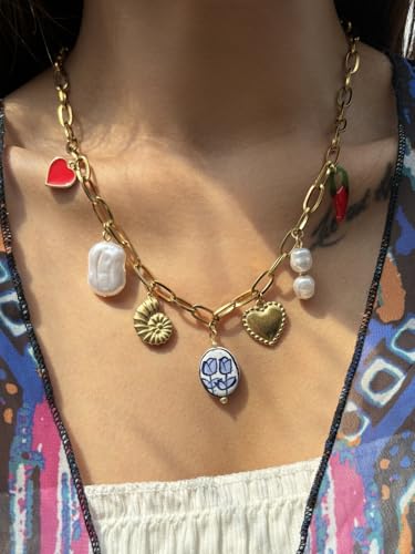 • Elegant Design: A delicate chunky gold charm necklace for women adorned with an array of charms, including hearts, pearls, and a decorative oval pendant.