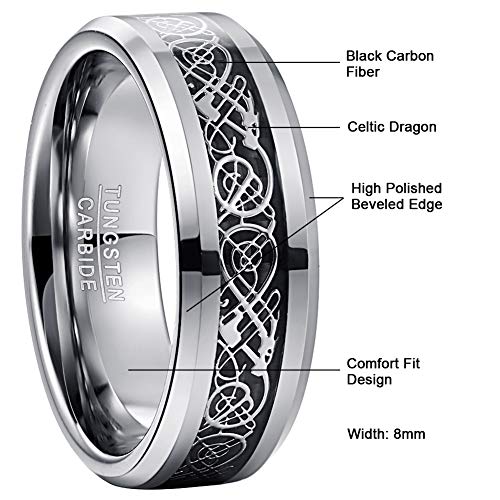 Vakki Celtic Dragon Rings for Men 8mm Blue/Silver Carbon Fiber Inlay Tungsten Carbide Wedding Band Beveled Edge Size 5-14 1