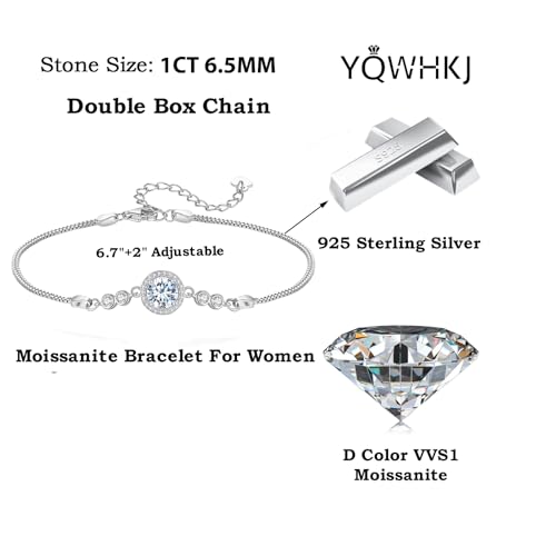 HOT ! 1CT Halo Round Moissanite Bracelet for Women,D Color Bracelet with GRA Certificate,925 Sterling Silver Box Chain 6.5"+2" (16.5cm+5cm Adjustable),Perfect Jewelry Gifts