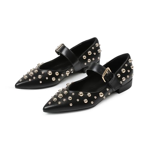 Rivets Ballet Flats Shoes for Women Pointed Toe Mary Jane Flats with Buckle Strap Rhinestone Ballerina Flats for Women Casual Dress Shoes 6