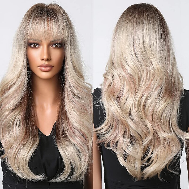 Long Ombre Pink Red Wavy Wigs for Women Black Pink Curly Wigs With Bangs Dark Roots Cosplay Wig Glueless Synthetic Wigs for Daily Party Use 31