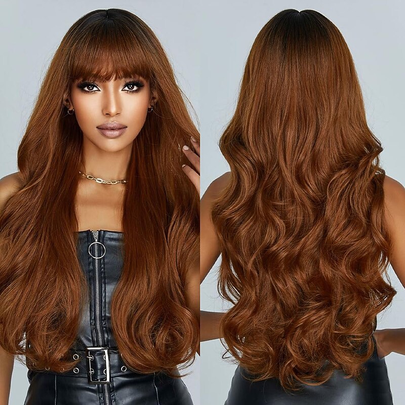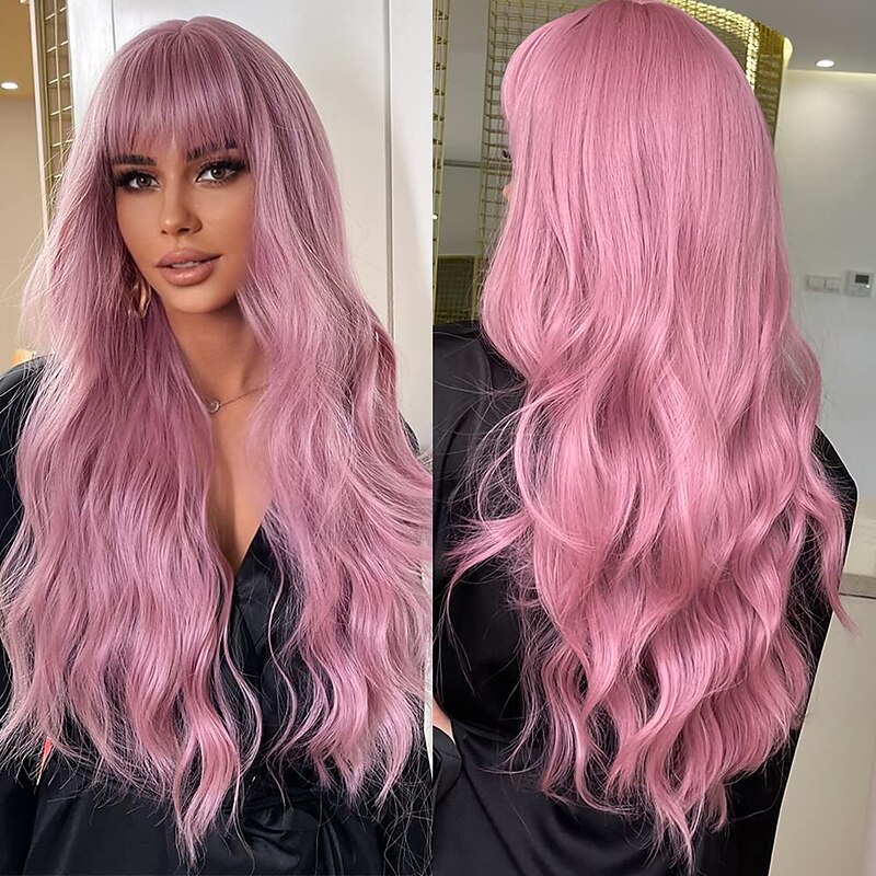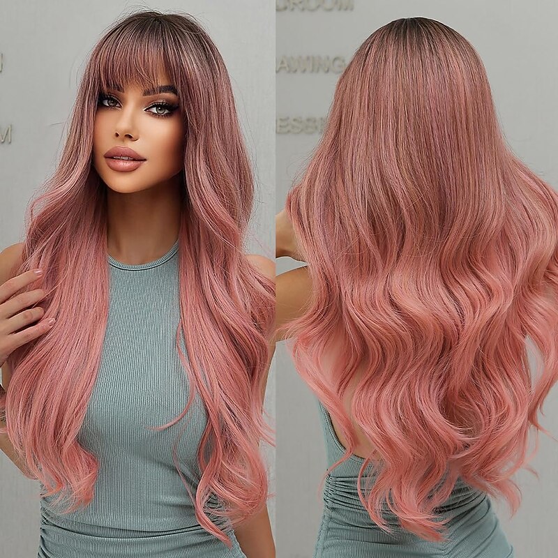 Long Ombre Pink Red Wavy Wigs for Women Black Pink Curly Wigs With Bangs Dark Roots Cosplay Wig Glueless Synthetic Wigs for Daily Party Use 27
