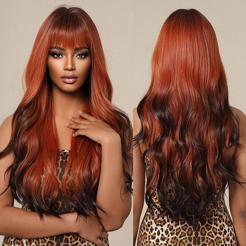 HOT ! Long Ombre Pink Red Wavy Wigs for Women Black Pink Curly Wigs With Bangs Dark Roots Cosplay Wig Glueless Synthetic Wigs for Daily Party Use