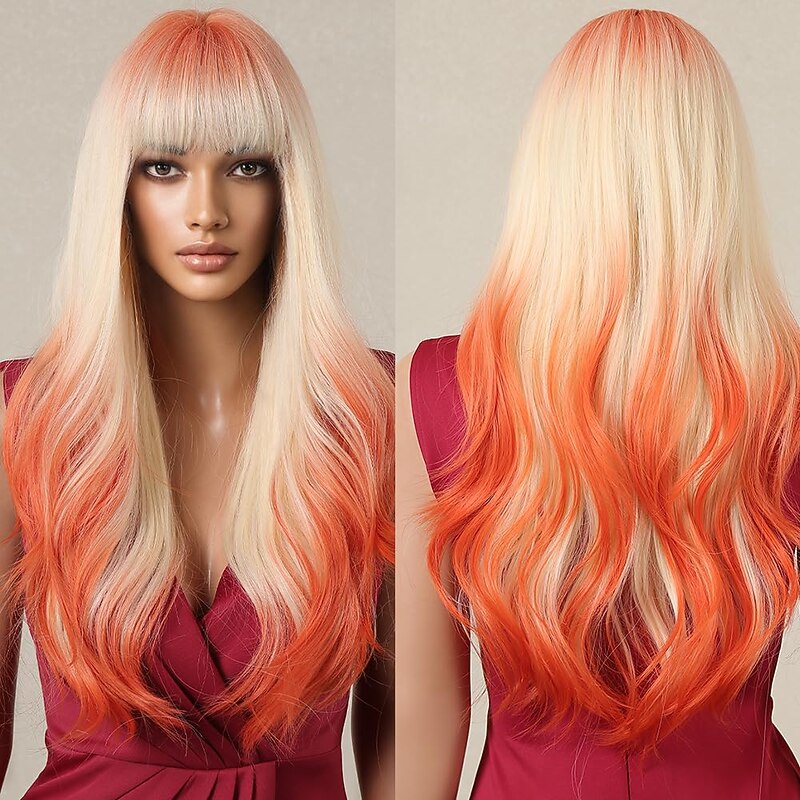 Long Ombre Pink Red Wavy Wigs for Women Black Pink Curly Wigs With Bangs Dark Roots Cosplay Wig Glueless Synthetic Wigs for Daily Party Use 29