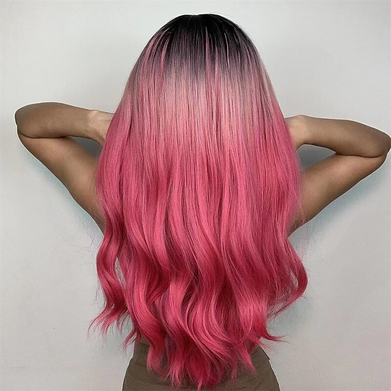 Long Ombre Pink Red Wavy Wigs for Women Black Pink Curly Wigs With Bangs Dark Roots Cosplay Wig Glueless Synthetic Wigs for Daily Party Use 38